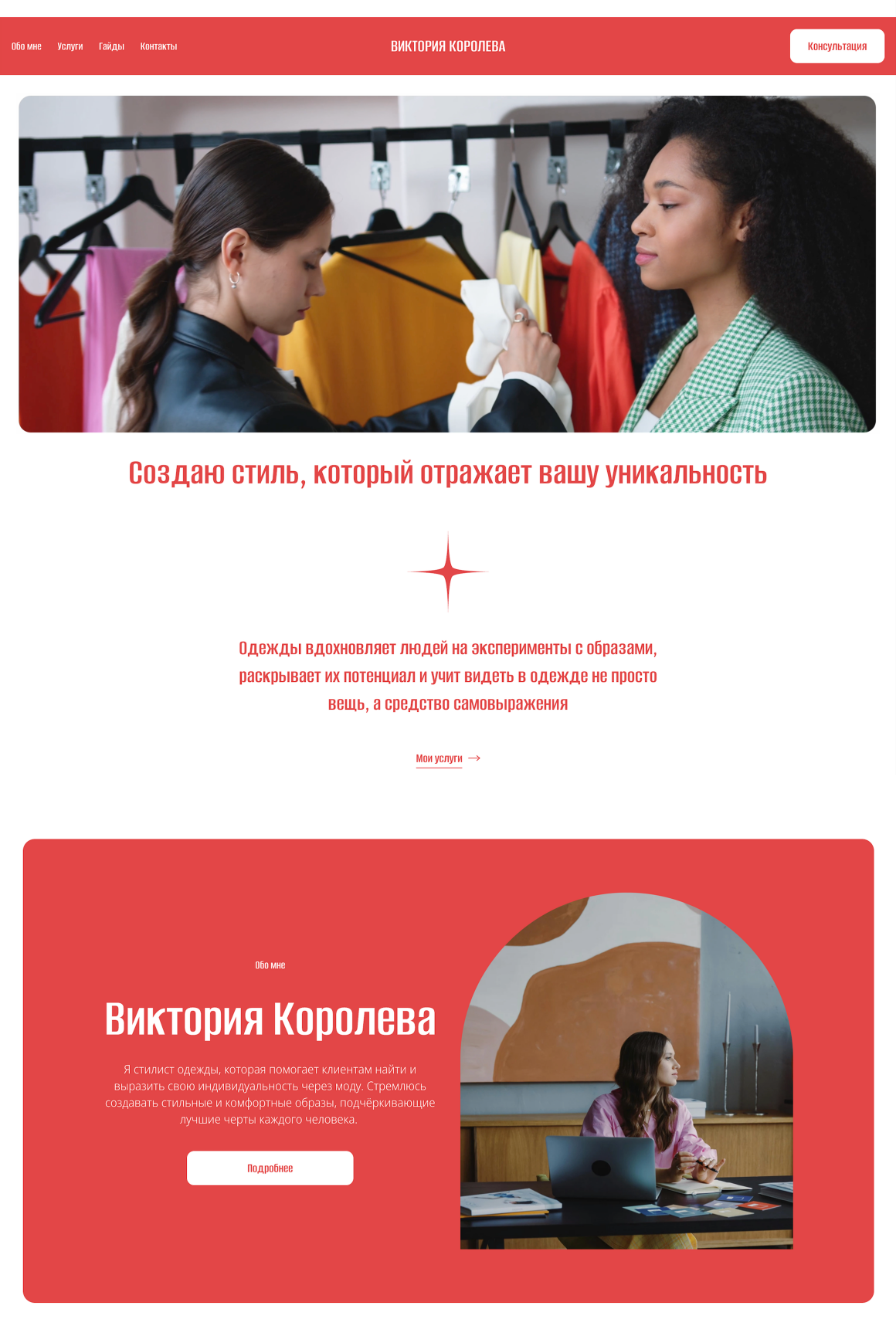 Визуальная концепция строится вокруг выразительного красного акцента (#e34647), который становится центральной нитью всей композиции. Этот цвет применяется для ключевых элементов интерфейса: кнопок призыва к действию, важных заголовков и важных ярко выраженных деталей, чтобы сразу привлекать внимание и создавать запоминающийся образ бренда.