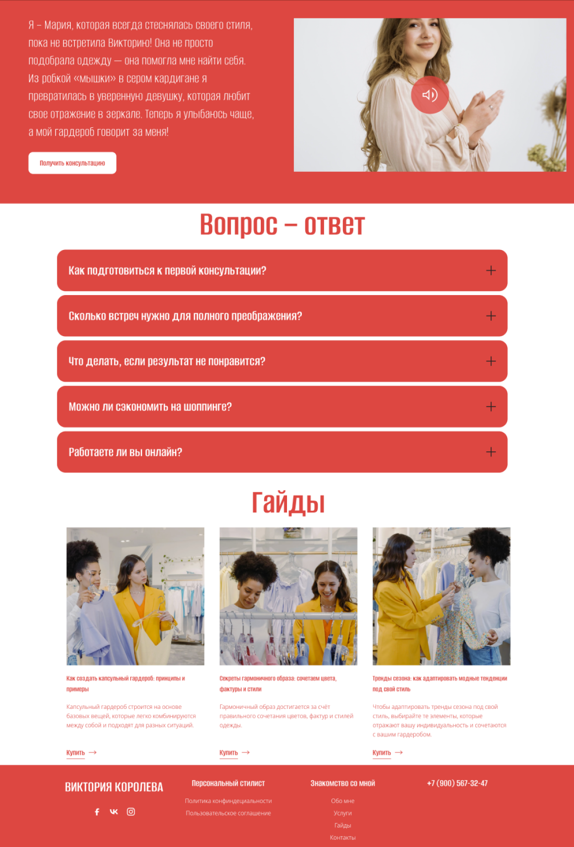 Анализ соцсетей и материалов Виктории показал её сильные стороны для сайта: экспертный контент, успешные кейсы преображений и высокая вовлечённость аудитории в видео-разборах гардероба.